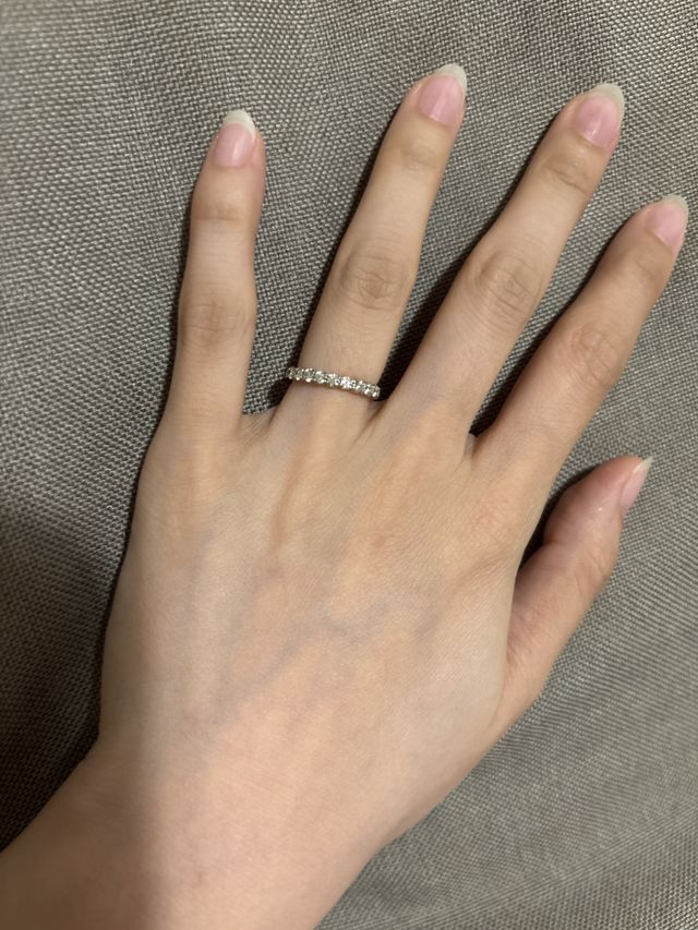 エタニティリングでダイヤモンドの品質がいいのでとても綺麗で華やかです。光があたると虹色にダイヤが光ります。粒感があり他のブランドにはないデザインのエタニティリングだと思います。もちろん付け心地もいいです。