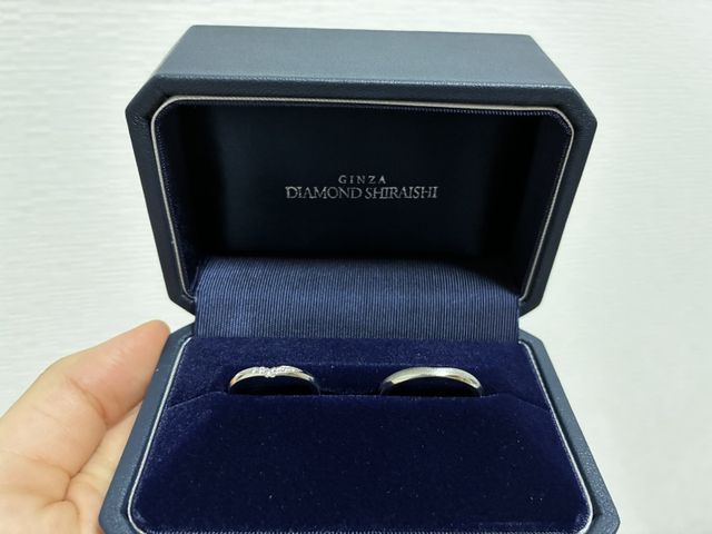 レディースは7石のメレダイヤが控えめながらも上品に輝き、婚約指輪と重ねづけしてもバランスがとても良いです。メンズはマットと鏡面のコントラストが美しく、手に馴染む着け心地でした。シンプルすぎず華やかすぎない絶妙なデザインで、長く愛用できそうです。