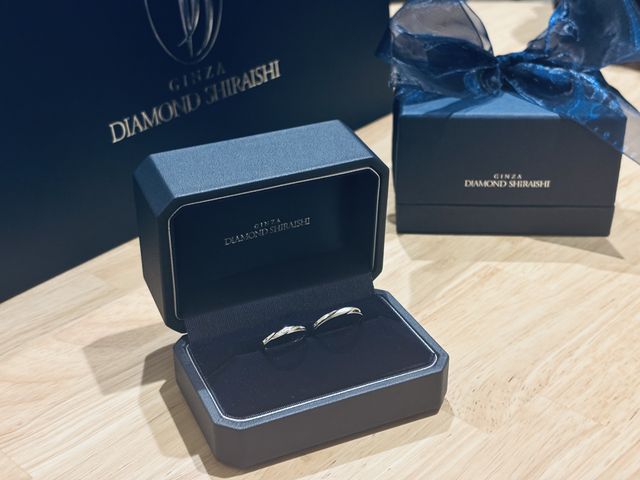プラチナかつシンプルという王道ベースにしました。とはいえ少し個性も欲しかったので、新郎新婦ともに一箇所だけ斜めにデザインがはいっているもの選びました。また、当該斜め部分に新婦側はダイヤを、新郎側はマット加工を入れてそれぞれ可愛さとカッコよさを取り入れたつもりです。とても気に入っています。
