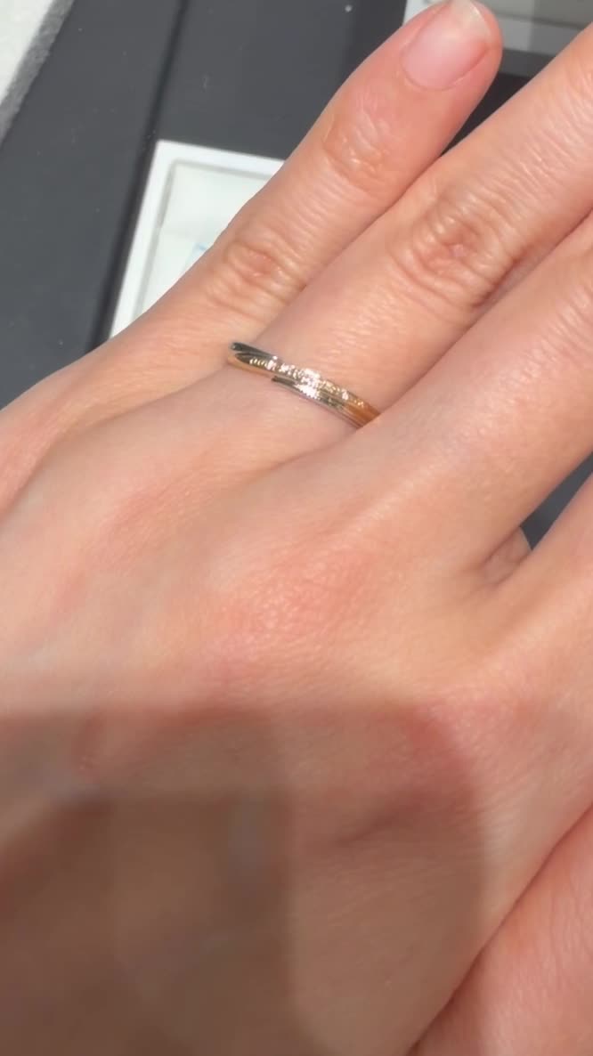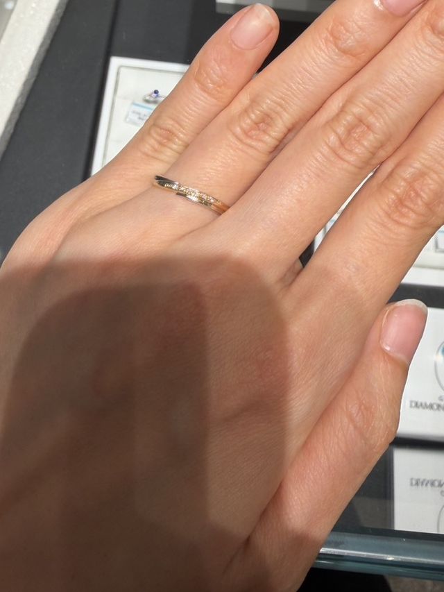 一見するとストレートですが、斜めに切れ込みがかかっており、ダイヤモンドもその流れに沿って斜めになっているため上品さの中にも滑らかな動きが感じられます。イエローゴールドなので肌馴染みもよく、普段使いしやすいと思いました。