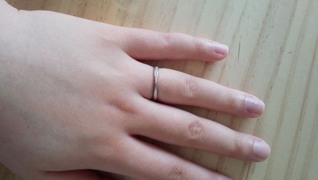 指が短く、ふっくらしていてくいこみやすいので、指がきれいに見えるものを探していました。ねじれているデザインなのでストレートのものよりも私にはあっているように感じました。ダイヤモンドも一部についているので、指輪をはめる向きを変えてダイヤモンドを見せると華やかな印象になったり、逆についていないシルバーの部分を見せると落ち着いた印象になるところも気に入っています。ただダイヤモンドが複数ついていて少しザラザラしており、たまにストッキングにダイヤモンドが引っかかりそうになるので、気をつけています。つけごこちも特に違和感が無く、日常生活ではずれる心配も無かったのでこちらの商品に決めました。