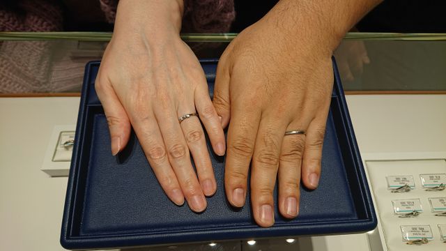 デザインで選びました。試着して即決でした。他のお店ではあまり見ないような形でとても気に入っています。彼のリングもつや消し加工を追加でつけて頂きとても好みのデザインに仕上がっています。価格にも満足です。