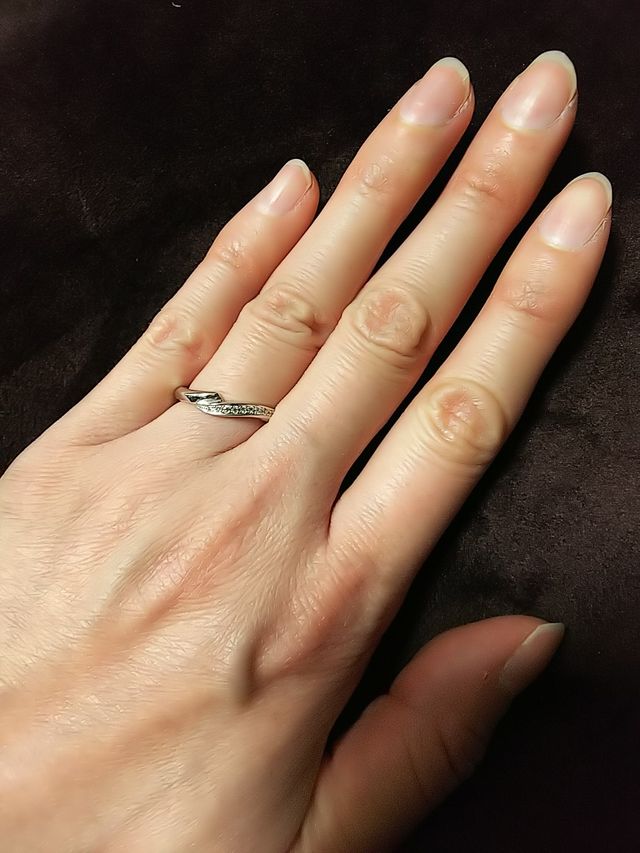 強いウェーブがかかったもののほうが指がキレイに見えたので、こちらのデザインを選びました。ただのウェーブではなく、少し動きのあるデザインなので、他の人とも被らなさそうと思いました。ダイヤモンドもたくさん並んでいて存在感があります。