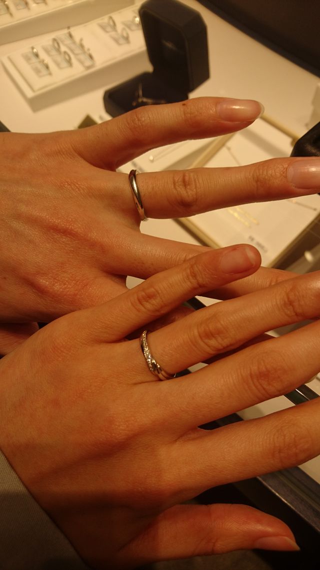 2人それぞれ気に入ったデザインのものを購入したので、それぞれでブランドもデザインも違います。私はエクセルコダイヤモンドのデザインとダイヤモンドの輝きに惹かれ、彼はダイヤモンドシライシのひねりの入ったデザインのものが気に入りました。他のお店ではペアのリングを勧められましたが、結果的にそれぞれの気に入ったものを妥協せずに選べたことが良かったです。