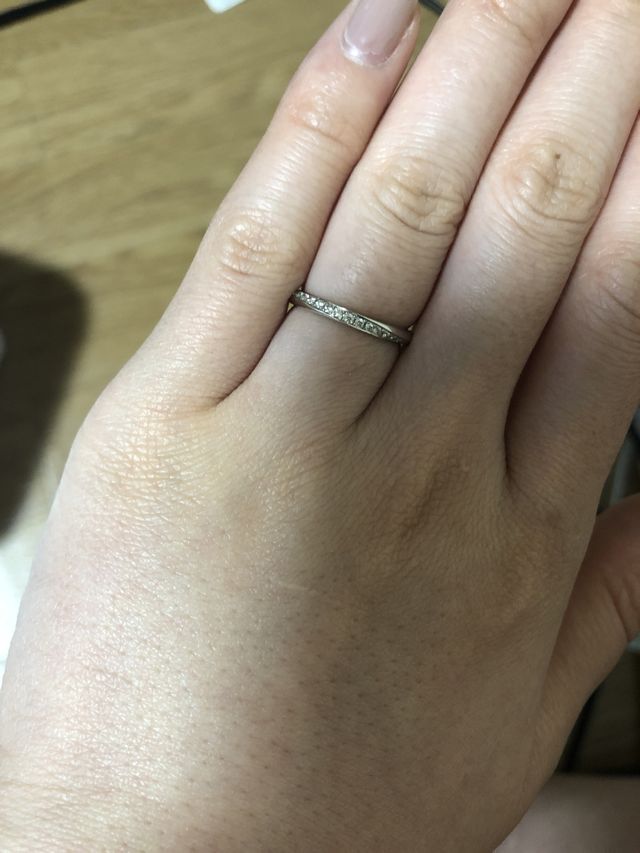 ぱっと見はストレートタイプに見えますが、ゆるくウェーブがかかっているので、ストレートの指輪よりもとても指に馴染んで見えます。どこからみてもメレダイヤがキラキラ輝いていて、さりげなくきらきらしているところろがきにいっています。