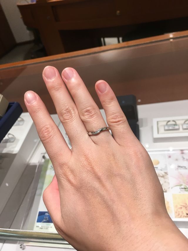 「天使のはしご」という意味をもつデザインの指輪でした。V字の形がオシャレで気に入りました。また、V字だと指が長く見える効果があるとのことでした。男性用の指輪は一部分がヘアライン加工されていて、シンプルな中にオシャレなところがあってとても良かったです。