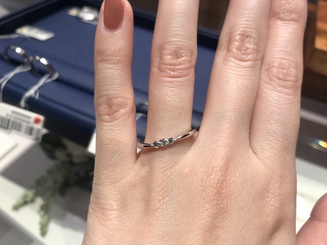 いくつかのお店で試着しましたが、他のお店にはないデザインだったため、こちらの指輪に決めました。エタニティリングのように細かなダイヤがたくさんついているものと悩みましたが、最終的に自分の指に馴染んだため。