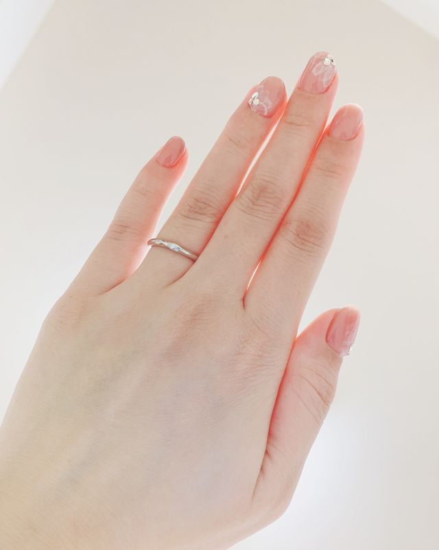 また、子供っぽい手なので、指が長く見える様にウェーブやV字になっているものを考えていましたが、ストレートでも指輪の太さによっては指が綺麗に見えるとわかったので、シンプルなストレートにしました。