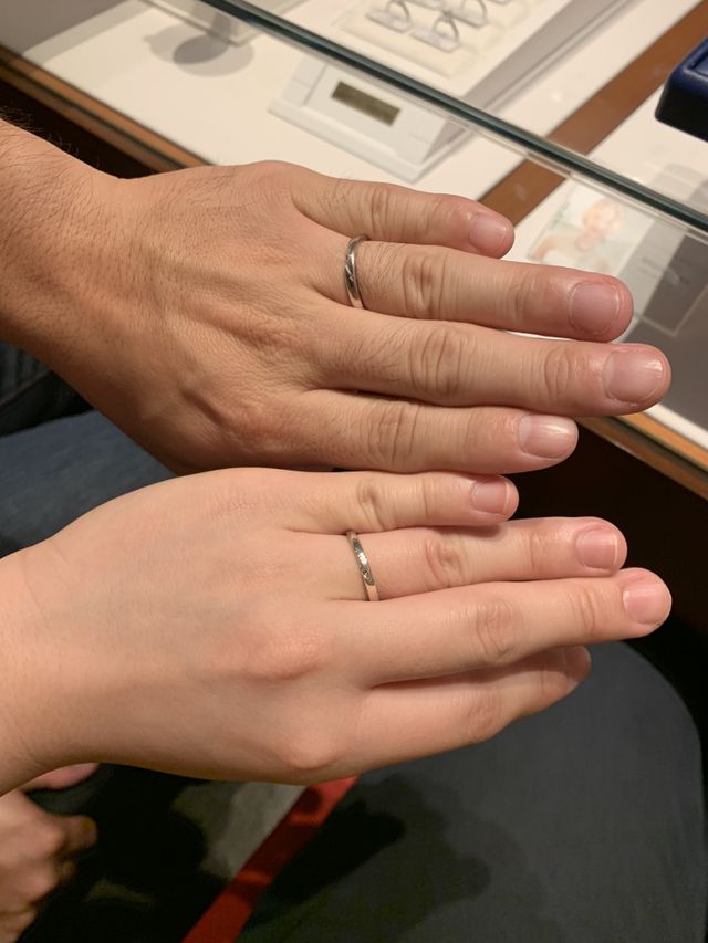 シンプルだけど自分の方から見たらダイヤが見えるという凝ったデザインが気に入り購入しました。何個か実際にはめてみてやはりこれが1番しっくりくると思いました。旦那と自分の入ってるダイヤの種類が違うのも洒落ているなと思いました。