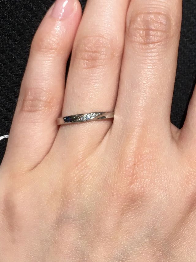 こちらは程よいキラキラで、指輪の形も自分の指に合っていると思いました。