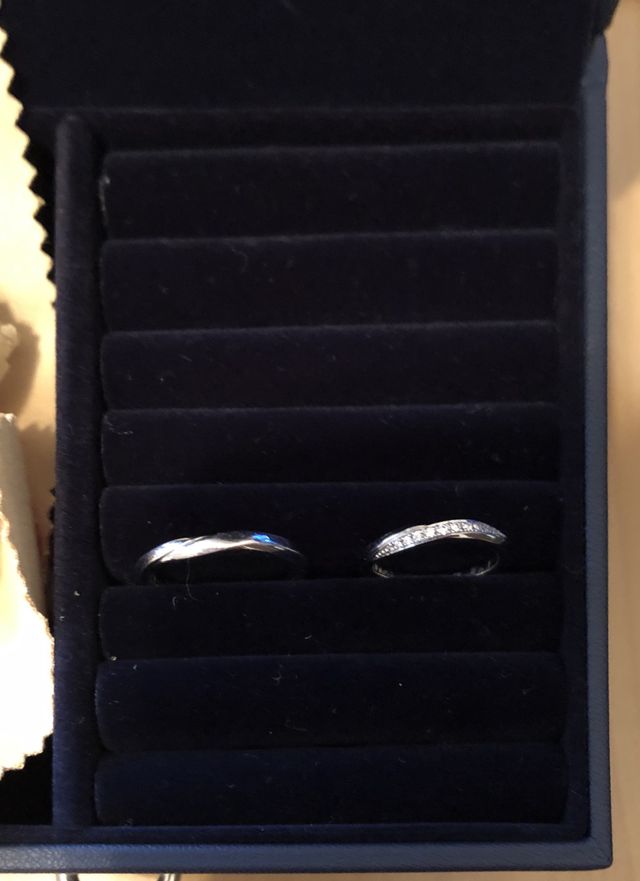 女性側の指輪のダイヤモンドの配置、輝きが美しく、つけ心地も良かった。ウェーブ型になっているため、つけた時の指が一番綺麗に見えた。男性側の指輪もシンプルながらもデザインが女性側とペア感があり、男性がつけても違和感のないデザイン。
