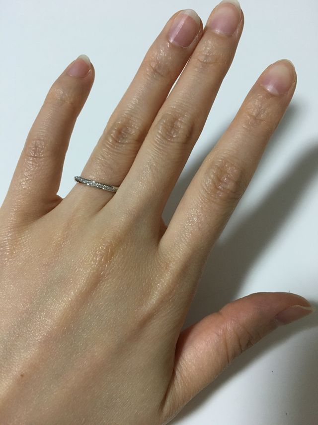 結婚指輪は細身でダイヤの多いキラキラしている指輪が良かったので、この商品を紹介してもらった時に完全に一目惚れしました。細身の指輪にここまでダイヤモンドを散りばめるのは難しいらしく、横から見てもダイヤがキラキラ輝いていてずっと見ていられる程綺麗です。一生付ける大事なものなので自分の気に入った素敵な指輪と出会えて幸せです=(^.^)=