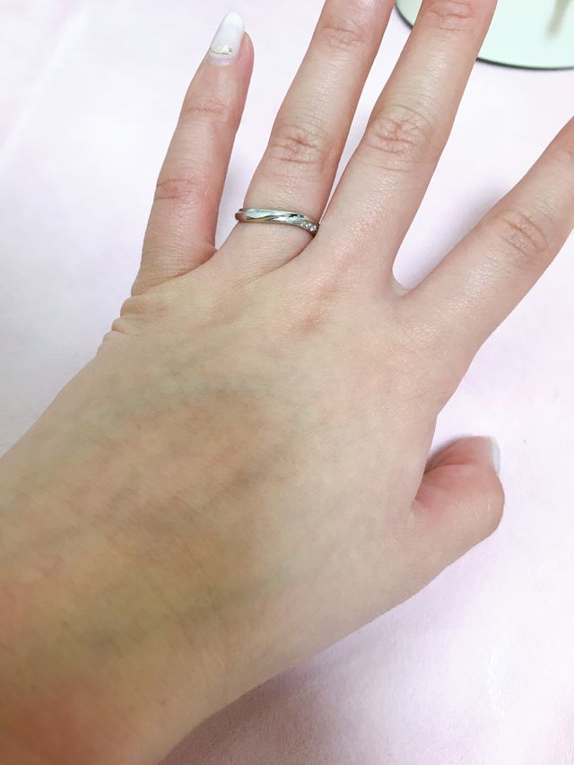 ウェーブがあることと、困惑指輪と重ね付けしたいので、派手すぎないダイヤを望んでいましたが、店員さんが持ってきてくれたものがドンピシャすぎて一目惚れしてしまいました。厚みも全てが好みで大好きなデザインです。