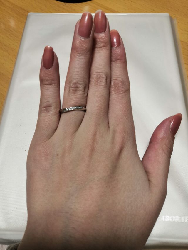 試着したときのフィット感とデザインが気に入りました。婚約指輪とセットリングなのでセットで着けるとより綺麗に見えるのがポイントです。緩やかなカーブと細めのリングなので、指が綺麗に見えます。派手すぎず、地味すぎず、丁度よいです。