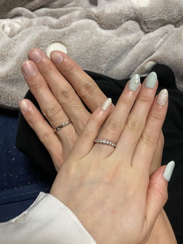 結婚指輪を選び始めた頃、指輪やダイヤモンドについて無知で、その頃は、それぞれのお店の指輪の違いがよくわかりせんでした。しかし、何日もかけて色々な指輪を見ていくと、ダイヤモンドの輝きなどの違いがよくわかるようになり、自分なりのこだわりも出てきました。他のお店も何店舗も見に行きましたが、銀座シライシダイヤモンドさんの指輪のダイヤモンドが1番キラキラ輝いていて、一目惚れしました。