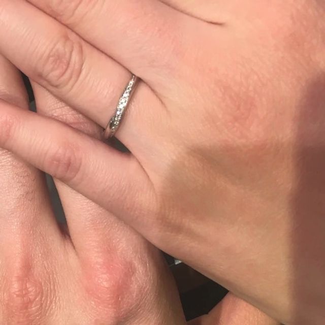 斜めにメレダイヤが配置されたリングを探しており、スタッフの方に希望を伝えたところ、多くのリングをオススメしてくれました。その中から選び試着していき、指にしっくりときたのがこのリングです。非常に付け心地が良く輝きも綺麗です。
