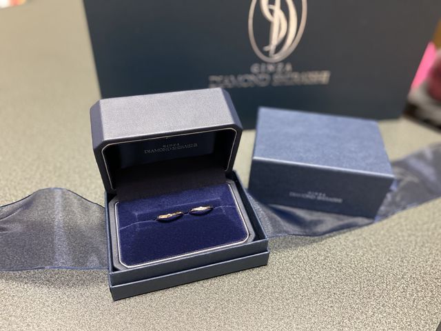 何個も試着し、たくさん悩みました。自分の指に合ったデザインを探すのは大変でした...(笑) でも幸い私たちの手の感じは似ていたので、似合うものもペアで探せるので良かったです。シンプルかつウェーブ、もしくはVラインのものを探していましたが、このデザインが1番二人ともがしっくり来たので、こちらを選ばせて頂きました。
