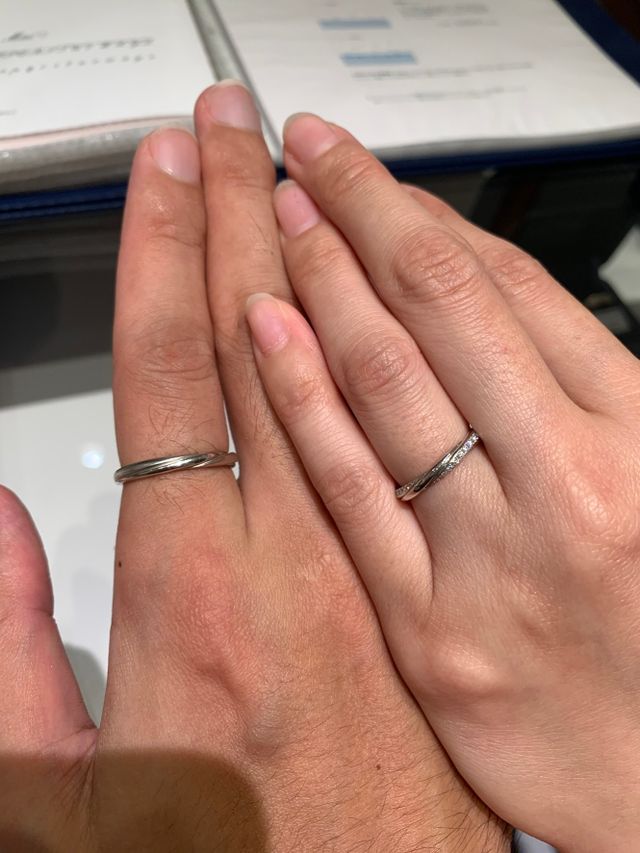 ダイアモンドシライシさんは指輪の種類が本当に豊富で、自分たちの好みを伝えたくさん試着しながら、指輪選びの軸を決めることができました。このデザインは捻りが入りながらも指輪幅2ミリで、指馴染みが良かったです!