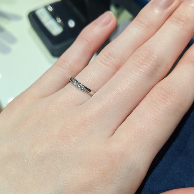 ペアで20万くらいを予定しており、その価格帯のリングを出してもらいました。彼は指がゴツゴツ・私は短く細い指なので、ストレートよりはウェーブやVラインを中心に試着しました。こちらのリングは着け心地が良く、逆さまに着けても見方が変わるとのことで、歳を重ねても楽しめるリングということで選びました。
