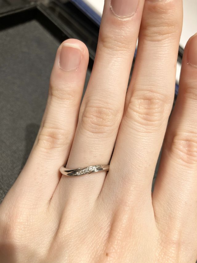 シンプルになりすぎず、ダイヤも入っていて普段使いできるデザインで探していました。リングはストレートよりカーブがある方が好みで指も細く見えるということでウェーブのタイプを試着しました。ダイヤの位置がサイドではなくちょうどセンターにあるので指輪が回ってしまってもダイヤが隠れないのがポイントです。