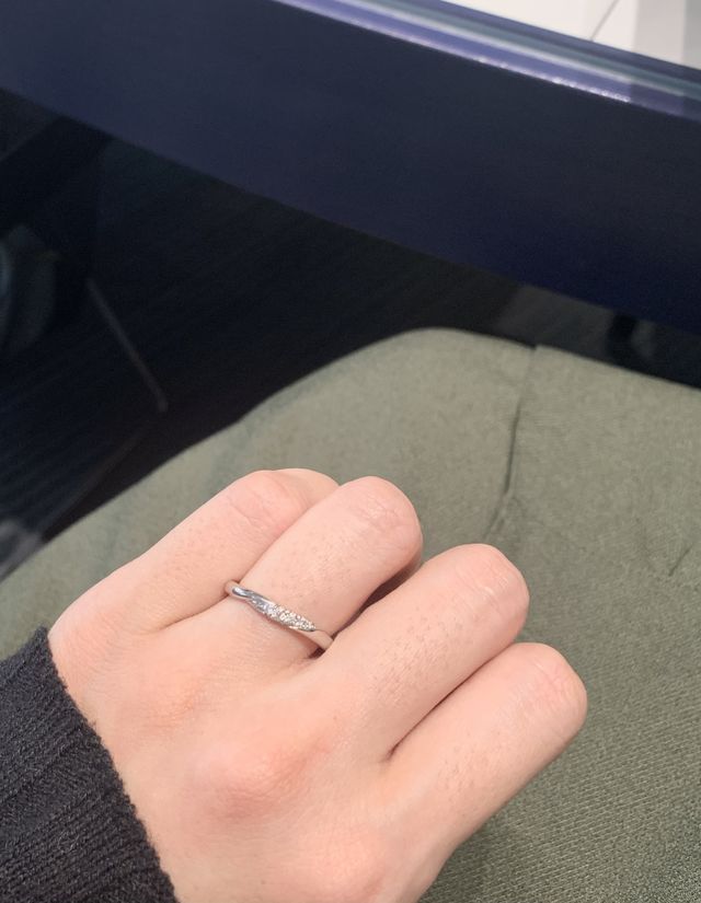 小さなダイヤが綺麗に敷き詰められていて上品に見せてくれている指輪でした。流れるようなデザインが好みではなかったのですが、このデザインはとても美しく、ダイヤとプラチナ両方を楽しめることができ素敵だと思いました。