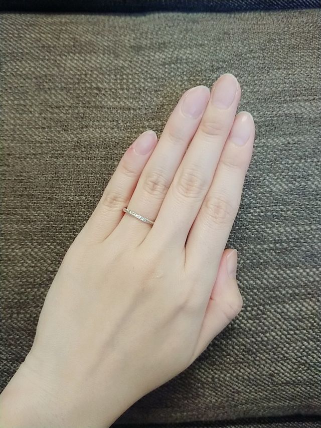 シンプルなストレートタイプの指輪を探していました。ダイヤがライン状に散りばめられてあるデザインは他のブランドにもよくありますが、ダイヤモンドシライシの指輪は指輪の上部にもダイヤがあしらってあります。正面だけではなく別の角度から見てもキラキラしてみえるのが決め手です。