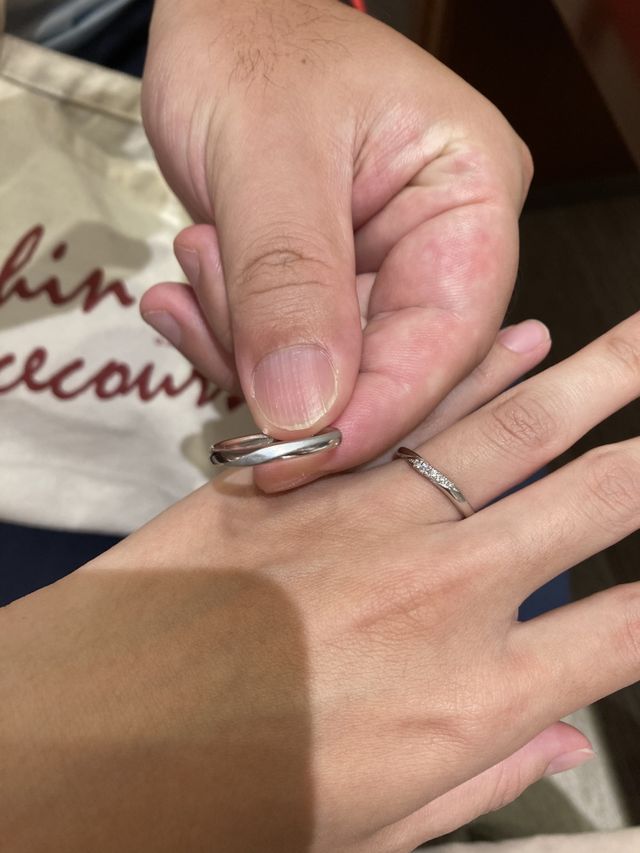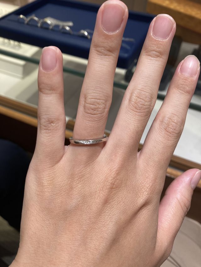 女性用はシンプルな形でありながら、少しウェーブがかっていて、ダイヤモンドが散りばめらていて、とてもおしゃれでした。男性用は形はシンプルですが、少し湾曲