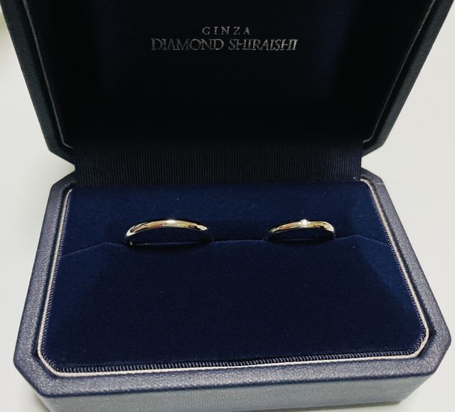 とにかくシンプルなものが良くて、表には石一つのみで、太さもかなり細めにしました。そのかわり、裏側にブラックダイヤモンドとルビー1つずつと、二人のイニシャルと星マーク入れました。リングサイズは5.5号です。