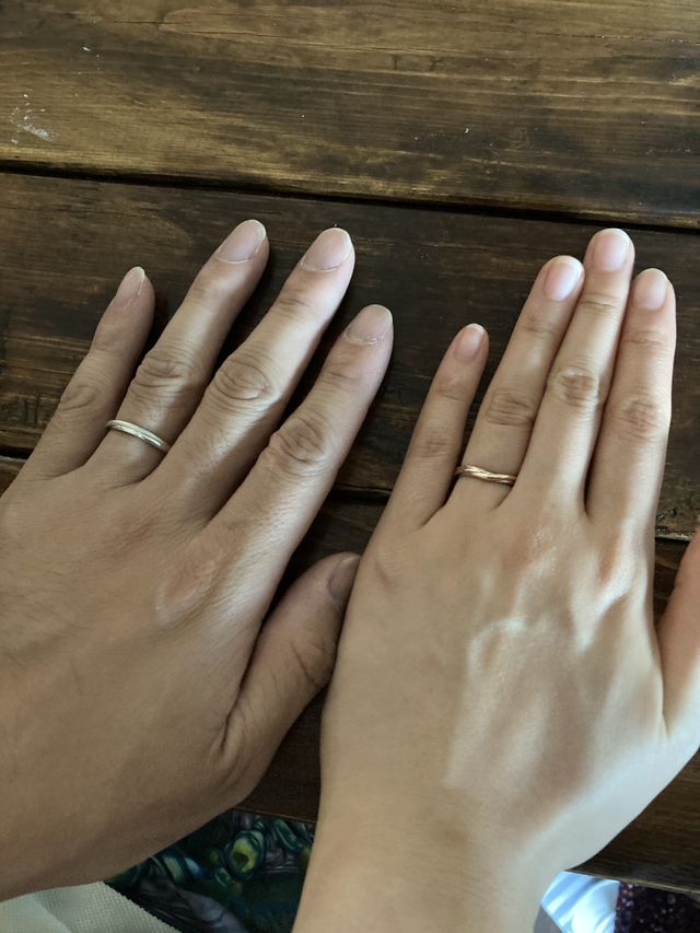 ピンクゴールドライン(夫はツヤ消し加工)を提案していただき、シンプルながらも個性のあるリングになってとても嬉しいです。