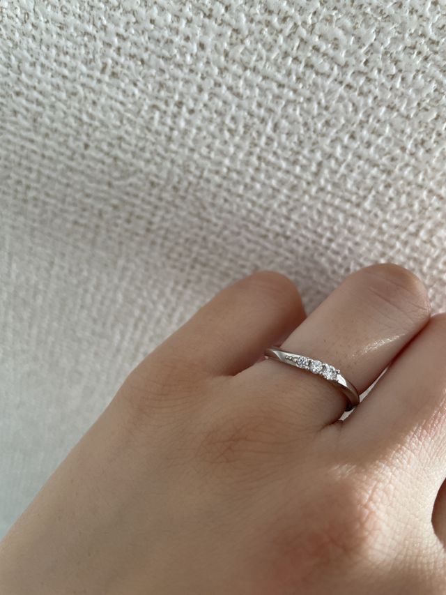 ダイヤが入っているデザインが良くて、3つ入っている指輪を選びました。埋め込みでダイヤの大きさも大中小とグラデーションになっていて、指輪のデザインもカーブがかかっているので指が綺麗に見えてお気に入りです。