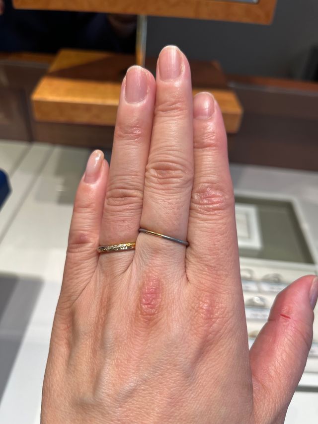 「輝く日々」という意味を持つリングで、きらびやかなリングでした。イエローゴールドとプラチナのコンビを試着しましたが、イエローゴールドのところに6石のメレダイヤがはめ込まれています。ウェーブのリングです。リング自体は好みのデザインでしたが、結婚指輪として長くつけるには、派手だと思いました。