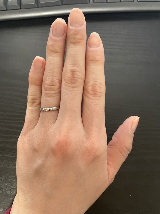 指輪の素材はプラチナでデザインはシンプルだけど、形状に少し動きがあるものが良いと思ってました。婚約指輪とセットでつけても着け心地がよく、シンプルな中にも一つダイヤモンドの輝きがあるところが決め手になりました。