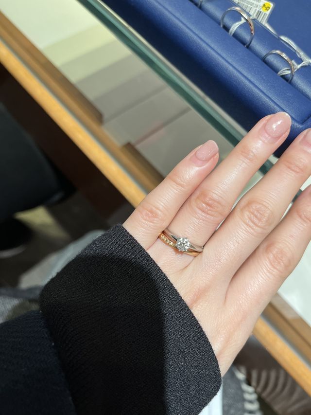 サプライズでもらった他ブランドの婚約指輪と重ね付けできるものを選びたくて見に行きました。婚約指輪がV字のものだったのですが、個人的にはウェーブが希望で重ね付けする上で上手く形が合わずしっくりこなかったのですが、ダイヤモンドシライシさんの商品ではストレートでも斜めにダイヤが入れてあるデザインのもので、婚約指輪とも合い単体ではめても可愛いものでした。