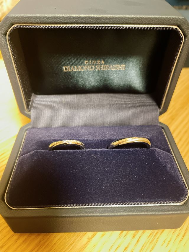 シンプルで王道なプラチナが結婚指輪のイメージでしたが、おしゃれな要素も入れたくてこのデザインにしました。つけた時に人からはシンプルなデザインに見えて、自分からは華やかに見えるのも気に入ったポイントです。