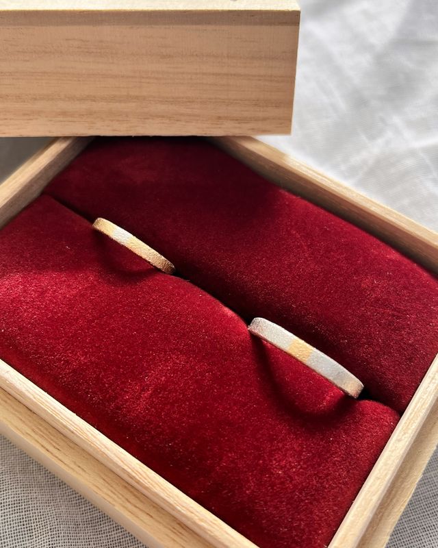 お互いの指輪の一部分を交換しているデザインです。色違いでゴールドとシルバーにしました。和風のデザインが良かったので石地にしましたが、大正解でした!!