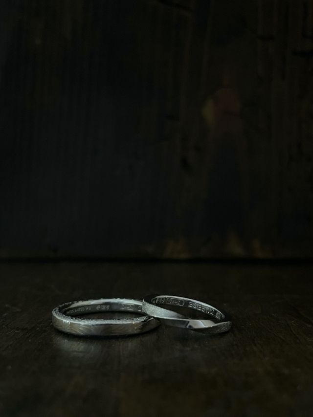 細かい部分のこだわりまで全部拾ってくれて「全部できます」と言ってもらえたので、デザインを考えている段階からワクワクが止まらず、それがいちばんの決め手でした。刻印も、二人の指輪をつなげると文字が読めるイニシャルデザインにしたかったのですが、それも対応できると言ってもらえて嬉しかったです。途中段階で試着できたことで、完成までの変化も楽しめました。