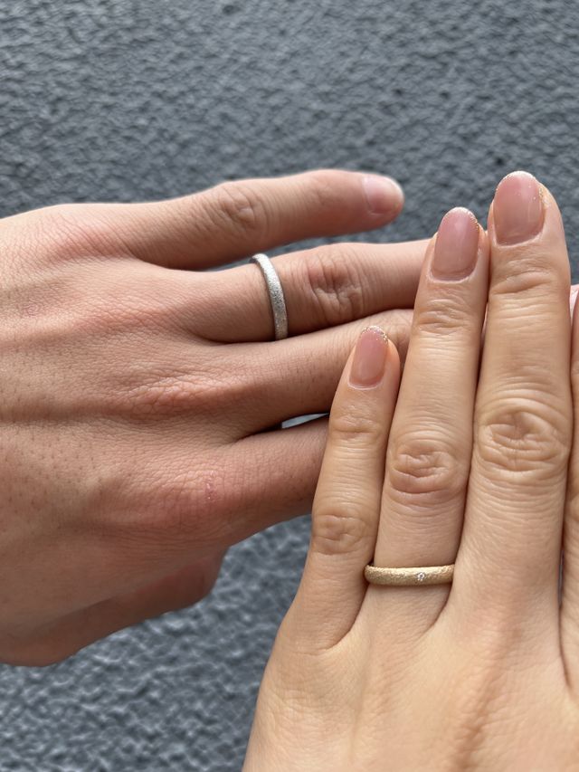自分たちの理想の形や色、素材が選べる。他店にはなかやかないブラウンゴールドや、粗めのザラザラや細かめのザラザラなど、フルオーダーできる。また、リングの一部分を新郎新婦で交換し素材の共有ができることが他にはなく魅力的でした。