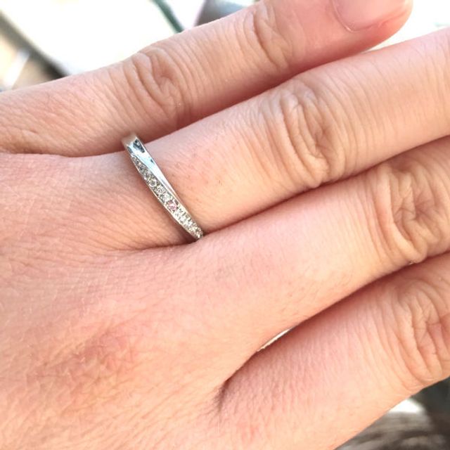 ピンクダイヤが上品で可愛らしい輝きだと思いました。個性的なデザインであり、店内の照明や日光に照らされてキラキラと輝いており、購入してよかったと思います。ダイヤモンドの数や大きさなどまさに結婚指輪といった感じの雰囲気ですね。