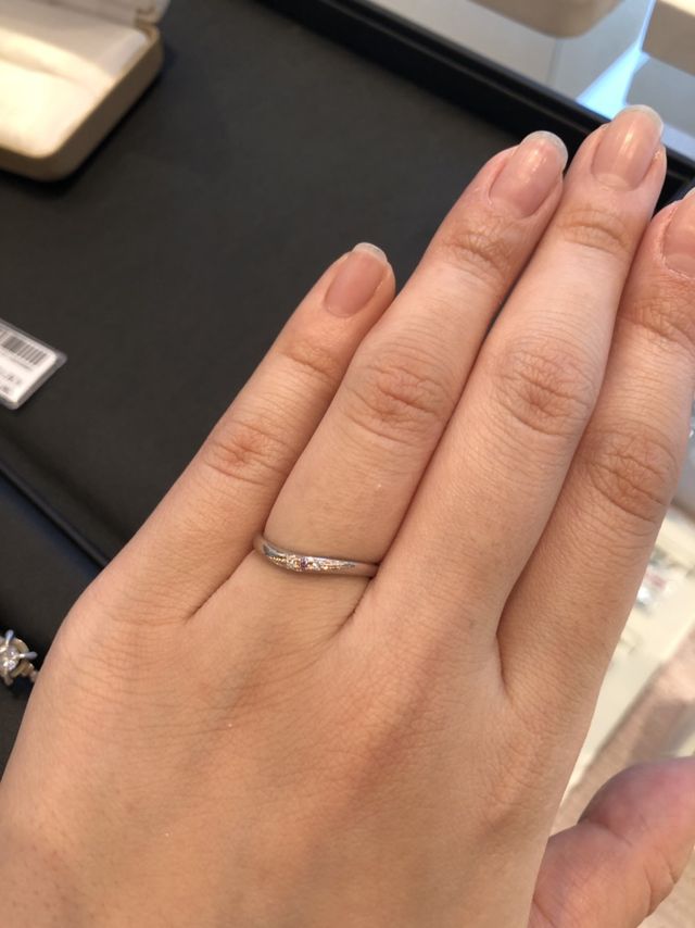 ウェーブデザインが指が綺麗に見えるという事でしたので、こちらを試着させてもらいました。真ん中にピンクダイヤ(自分で好きな色を選ぶことが出来る)があり、その周りにメレダイヤ、そしてミル打ちがデザインされていてとても可愛かったです。