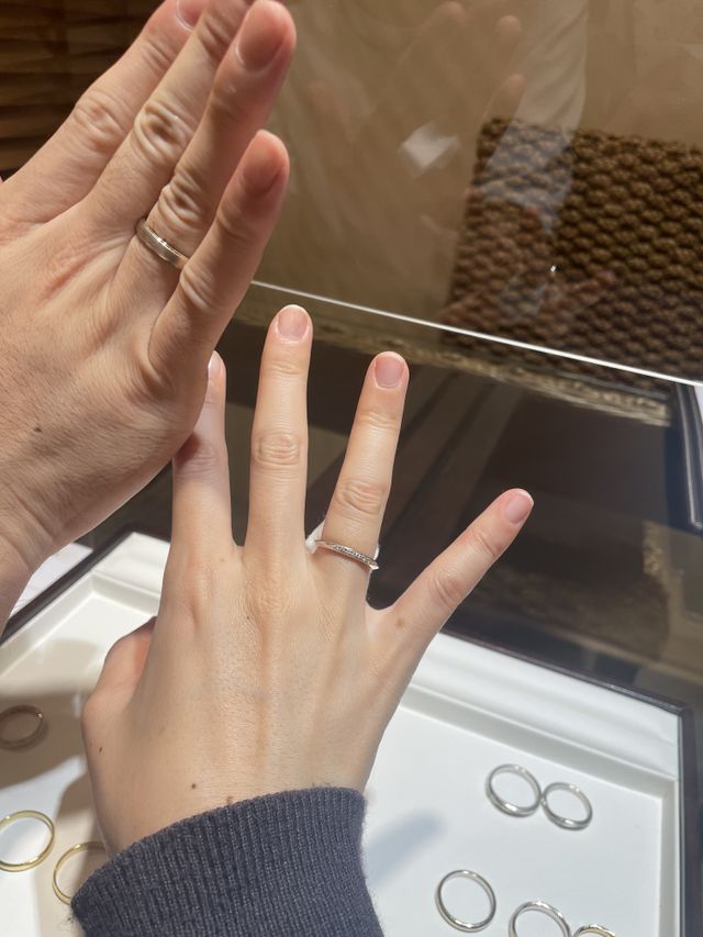 こちらのお店は木目調の指輪が定番としてあり、他のブランドとは違うものも見てみたいと思い来店しましたが、こちらの指輪のような定番の形やデザインもありました。シンプルですが、長く疲れそうだと思いました。木目調のデザインにするのに色や素材を選べるのも良かったです