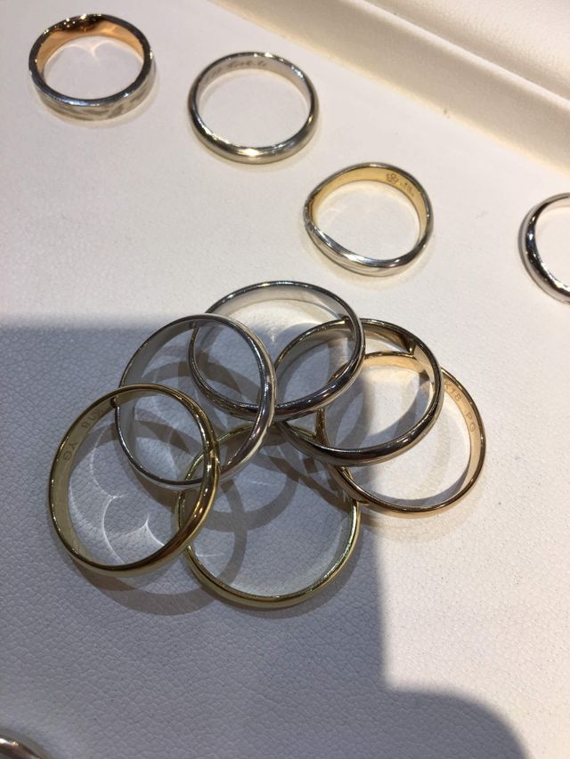 マリッジリングはプラチナを使うのが一般的だと思いますが、ここではあえて、様々なゴールド素材を使用して、木目模様になるようにしているようです。