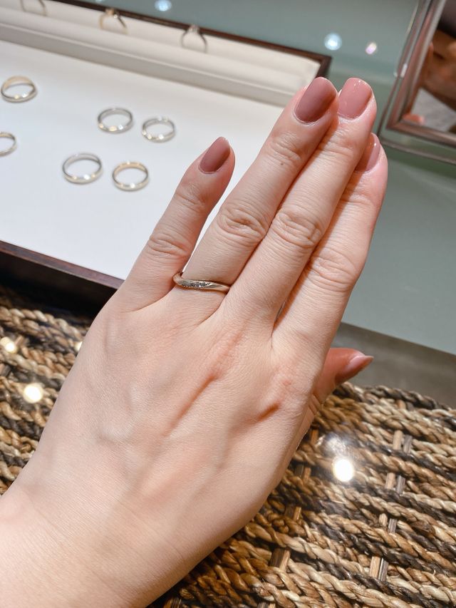 斜めに流れるようにダイヤを配置しており、指が細長く綺麗に見える指輪でした。こちらのブランドの代名詞でもある木目デザインもしっかり入っています。ぱっと見はスタンダードな結婚指輪ですが、よく見ると木目柄というこだわりも素敵だなと思いました。