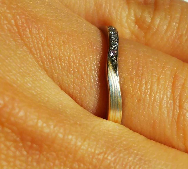 オーダーで様々なデザイン・アレンジに対応していますし、刻印の自由度が高いのも気に入りました。選んだリングは違う色合いの金属をかけ合わせて造られる杢目模様が非常に綺麗に見えるリングデザインですし、ダイヤモンドの輝きもとても綺麗ですね。