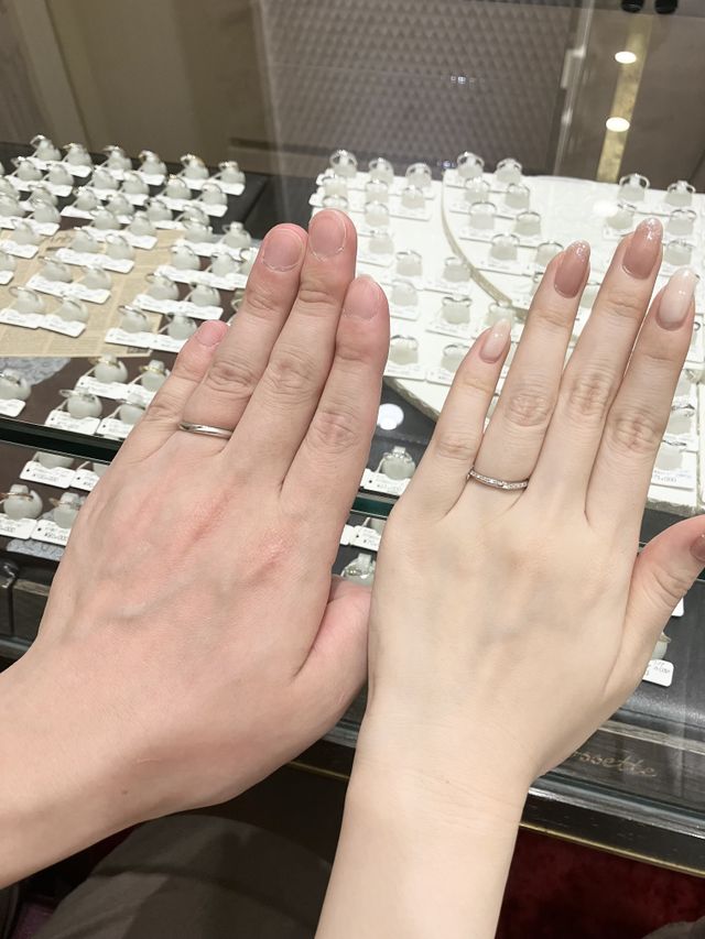 たくさんの指輪の中から希望に沿った指輪をご提案してくださいました。女性用指輪のダイヤモンドと同じ位置に男性用指輪のマット加工をすることをご提案頂き、実際に仕上がったところを見るとより強くお揃い感が出て大変気に入りました。