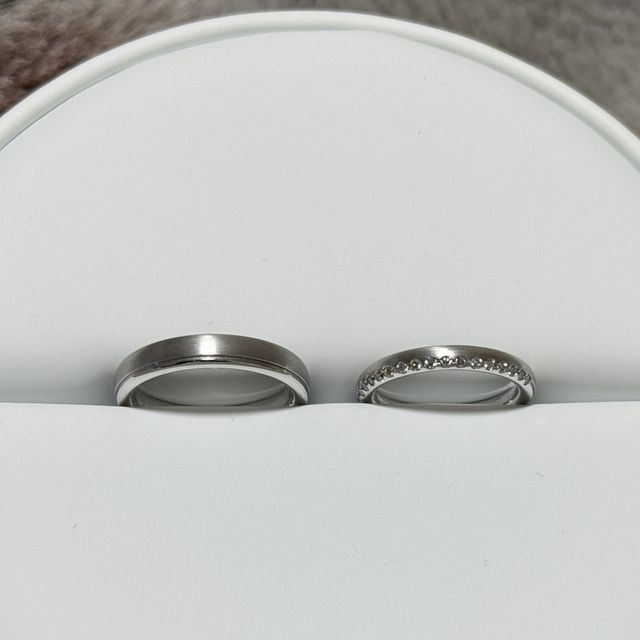 こちらはハーフエタニティ風で指輪の外周では無くやや側面に石が着いているところもポイントかなと思います。やっぱり自分で見やすいところがキラキラしてると気分も上がりますね。ダイヤ側の側面のみツヤ加工されてるので、つや消しの本体と相まってより輝いて見えます。