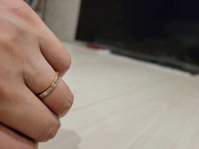 リングははだ馴染みの良いゴールドにしました。ダイヤが入っていて、ハーフエタニティのデザインです。ダイヤが四角いところがとても個性的で、アンティークな雰囲気もあります。ただのゴールドよりもきらきらと輝きます。