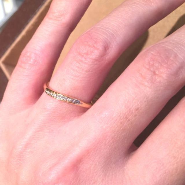 最初来店する前は指輪の素材はプラチナであると決めていましたが、実際に試着してみるとゴールドの方が指に馴染んだためゴールドにしました。またダイヤモンドの数はアレンジが出来るとの事で、こちらの指輪に決めました。シンプルですが、ダイヤの存在感もきっちりあります。