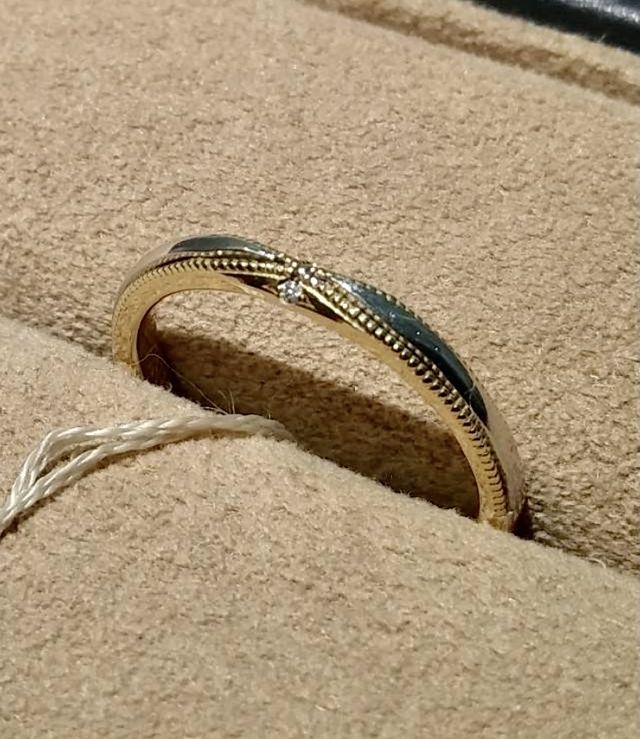 真ん中がくびれていて、リボンのようになっているデザインがとても可愛かったです。ダイヤが1粒ついててデザインにそってミル打ちがしてあり、細かいところまで素敵だなと思いました。細身でつけ心地も良かったです。