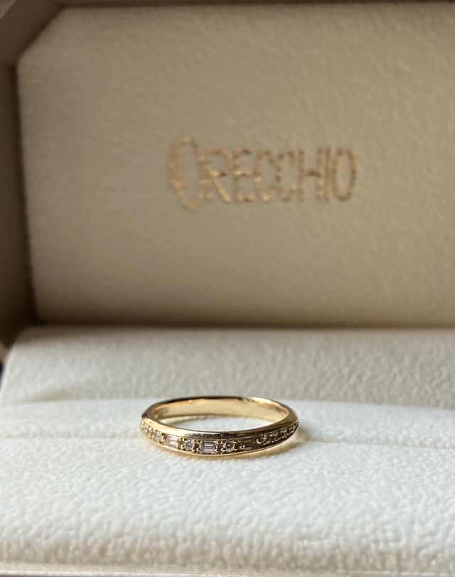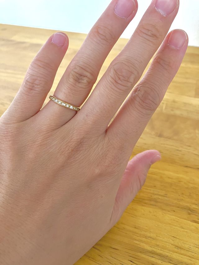 ハーフエタニティーで、細すぎず、太すぎず、緩やかなU字ラインで、ありきたりなデザインではなく、デザイン性の高い指輪を探していたので、オレッキオのこの指輪はまさにどストライクでした。