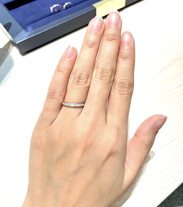 ゆるやかなU字で手が綺麗に見えること、自分に似合うデザインで着け心地がいいことが一番の決め手でした。デザインについてこだわりはありませんでしたが、オレッキオならではのエメラルドカットのダイヤモンドが埋め込まれており、他のハーフエタニティリングとは違う特別な輝き方の指輪であることも決め手の一つでした。